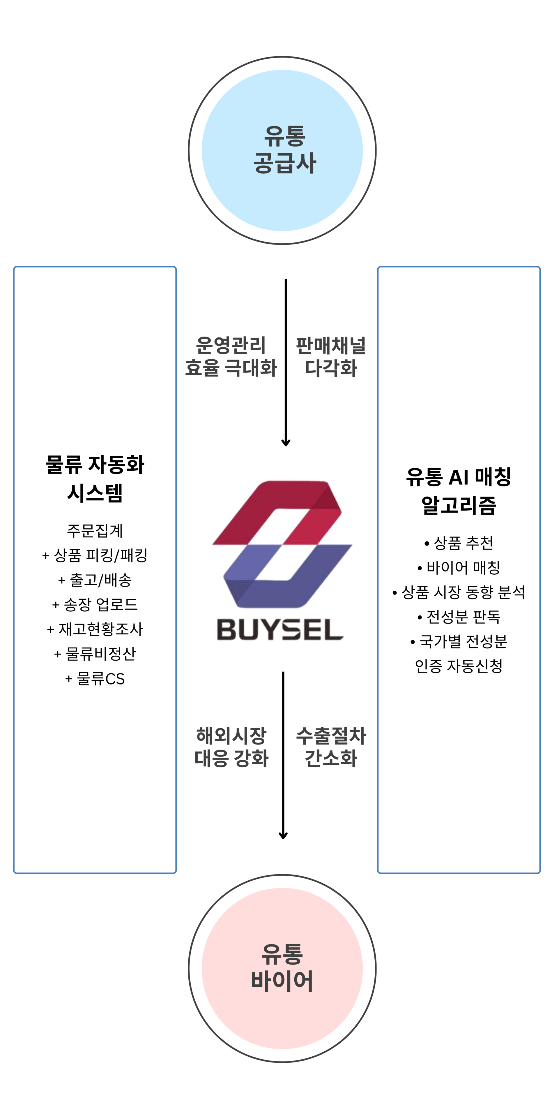 BUYSEL은 '사고팔다'의 Buy, Sell의 합성어로, 사업 20년의 노하우와 빅데이터를 베이스로 유통과 해외 수출물류를 효과적으로 지원하는 AI 플랫폼입니다.